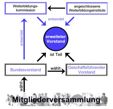 Die Weiterbildungskommission besteht aus den entsandten einzelnen Vertretern der dem Verband angeschlossen Weiterbildungsinstitute, sowie aus drei Mitgliedern, die der Bundesvorstand mehrheitlich wählt, und maximal drei externen Prüfern. Die Weiterbildungskommission gibt sich unter Beteiligung der drei vom Bundesvorstand gewählten Mitgliedern eine Geschäftsordnung als Weiterbildungskommission und beginnen ihre Tätigkeit für jeweils fünf Jahre.